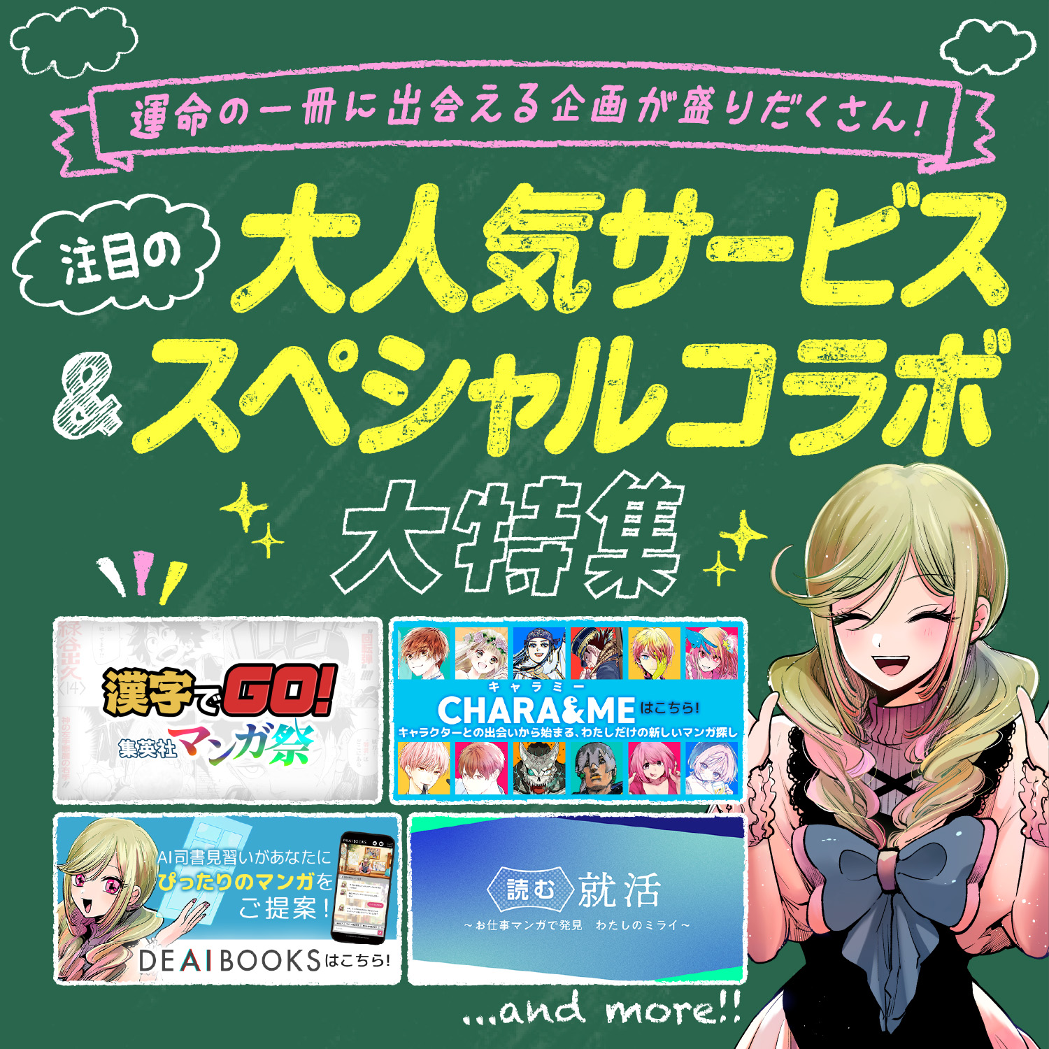 現在提供中のマンガオススメサービスから、話題の大型コラボ企画まで、運命の一冊に出会える企画が盛りだくさん!自分の好みのマンガを見つけよう!